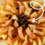 3. Warm and drizzle the toppings. I gently warm the peanut butter (about 15–20 seconds in the microwave) until it’s easy to drizzle. Then I drizzle it over the apple slices using a spoon or piping bag.
