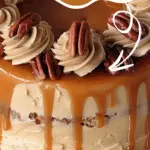 I pour this warm caramel butter pecan praline sauce over the cake, making sure it gets into every hole and spreads evenly across the surface.