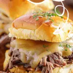 Buttery, melty French dip sliders stacked with roast beef, caramelized onions, and provolone—baked until golden and served with warm au jus for dipping.