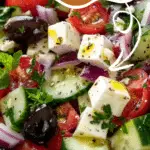 The Best Greek Salad packed with fresh vegetables, tangy feta cheese, olives, and oregano dressing. A vibrant Mediterranean salad that works perfectly as a light lunch or flavorful side dish.