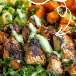 A healthy and delicious grilled chicken bowl with roasted sweet potatoes and creamy avocado sauce—perfect for meal prep or a balanced weeknight dinner.