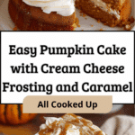 This pumpkin cake with whipped cream cheese frosting and maple caramel drizzle is a cozy, fall-inspired dessert. It’s moist, warmly spiced, and topped with tangy whipped frosting and a rich, sweet maple caramel sauce.